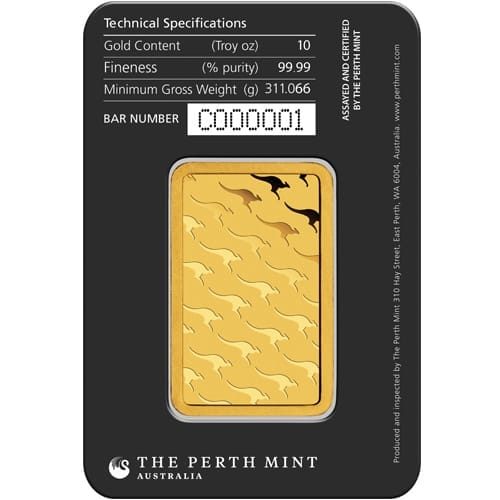 The 10 oz Perth Mint Gold Bar from Veldt Gold, featuring CertiCard security and available for purchase with Bitcoin, Ethereum, Monero, and other cryptocurrencies, ensures authenticity and brand-new condition with its distinctive Perth Mint designs and assay card.