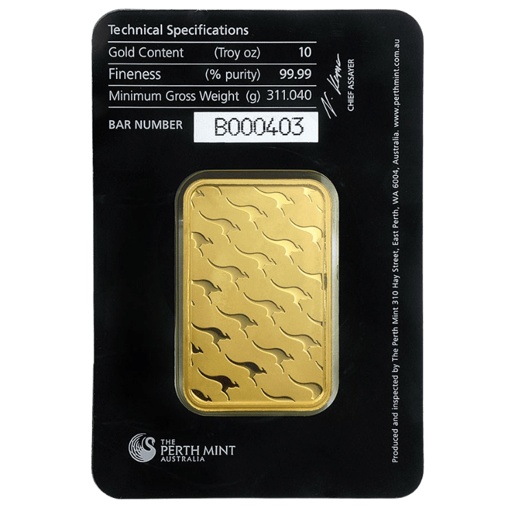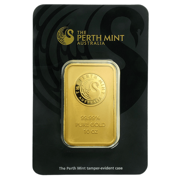 The 10 oz Perth Mint Gold Bar contains 10 troy ounces of .9999 fine gold from one of the world’s most trusted mints. Presented in a new format with assay packaging, it offers substantial gold weight with strong visual presentation and easy verification.